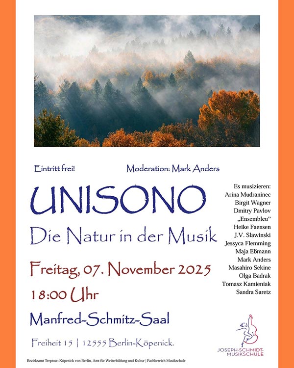 Das Motto des diesjährigen Konzertes ist „Die Natur in der Musik“. Seit es Musik gibt, haben Musiker das Geschehen der umgebenden Natur in ihre Werke einfließen lassen – bewusst oder unbewusst, direkt oder indirekt. Seit 25 Jahren besteht die Konzertreihe mit dem Namen UNISONO (italienisch „mit einer Stimme, im Einklang“) an der Joseph-Schmidt-Musikschule. Mitwirkende sind Lehrer*Innen und ehemalige Schüler*Innen.